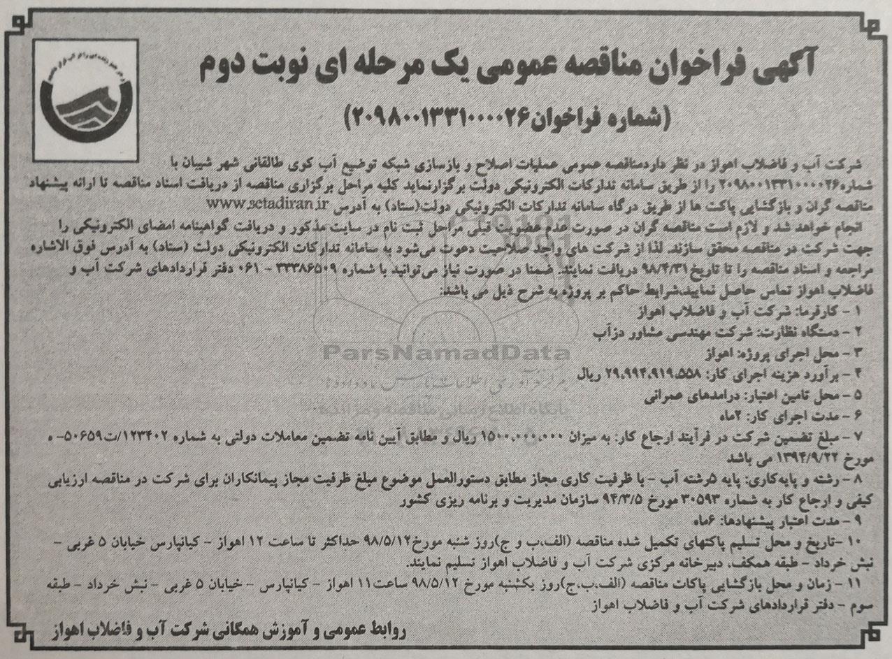شرکت آب و فاضلاب اهواز در نظر دارد مناقصه عمومی عملیات اصلاح و بازسازی شبکه توزیع آب کوی طالقانی شهر شیبان با شماره 2098001331000026 را از طریق سامانه تدارکات الکترونیکی دولت برگزاز نماید کلیه مراحل برگزاری مناقصه از دریافت اسناد مناقصه تا ارائه پیشنهاد مناقصه گران و بازگشایی پاکت ها از طریق درگاه سامانه تدارکات الکترونیکی دولت ستاد به آدرس ستاد انجام خواهد شد و لازم است مناقصه گران در صورت عدم عضوت قبلی مراحل ثبت نام در سایت مذکور و دریافت گواهینامه امضای الکترونیکی را جهت شرکت در مناقصه محقق سازد لذا از شرکت های واجد صلاحیت دعوت می شود به سامانه تدارکات الکترونیکی دولت ستاد به آدرس فوق الاشاره مراجعه و اسناد مناقصه را تا تاریخ 98.04.31 دریافت نمایند. ضمنا در صورت نیاز می توانید با شماره 33386509-061 دفتر قراردادهای شرکت آب و فاضلاب اهواز تماس حاصل نمایند شرایط حاکم بر پروژه به شرح ذیل می باشد