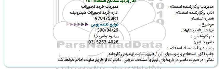 اداره برگزارکننده استعلام: اداره خرید تجهیزات هیدرولیک