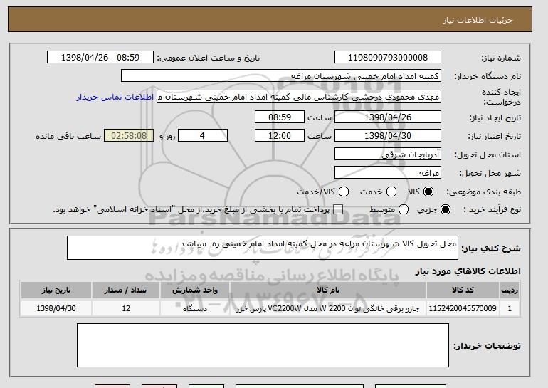 شرح کلی نیاز: محل تحویل کالا شهرستان مراغه در محل کمیته امداد امام خمینی ره میباشد