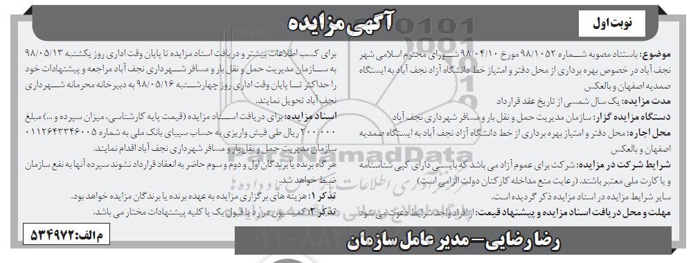 موضوع: به استناد مصوبه شماره 98/1052 مورخ 98.04.10 شورای محترم اسلامی شهر نجف آباد در خصوص بهره برداری از محل دفتر و امتیاز خط دانشگاه آزاد نجف آباد به ایستگاه صمدیه اصفهان و بالعکس