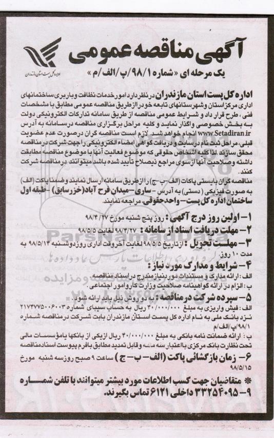 اداره کل پست استان مازندران در نظر دارد امور خدمات نظافت و باربری ساختمانهای اداری مرکز استان و شهرستان های تابعه خود را از طریق برگزاری مناقصه عمومی مطابق با مشخصات فنی , طرح قرارداد و شرایط عمومی از طریق سامانه تدارکات الکترونیکی دولت به بخش خصوصی واگذار نماید کلیه مراحل برگزاری مناقصه در سامانه به آدرس ستاد انجام خواهد شد لازم است مناقصه گران در صورت عدم عضویت قبلی مراحل ثبت نام در سایت و دریافت گواهی امضاء الکترونیکی را جهت شرکت در مناقصه محقق سازند لذا از کلیه اشخاص حقوقی که موضوع فعالیت آنها با موضوع مناقصه مطابقت داشته و صلاحیتشان از سوی مراجع ذیصلاح تایید شده می توانند در مناقصه شرکت نمایند