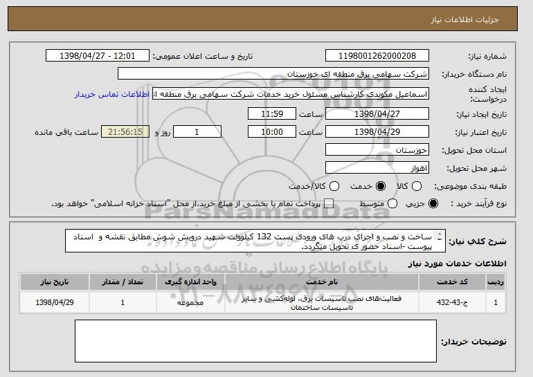 شرح کلی نیاز: ساخت و نصب و اجرای درب های ورودی پست 132 کیلوولت شهید درویش شوش مطابق نقشه و اسناد پیوست -اسناد حضور ی تحویل میگردد.