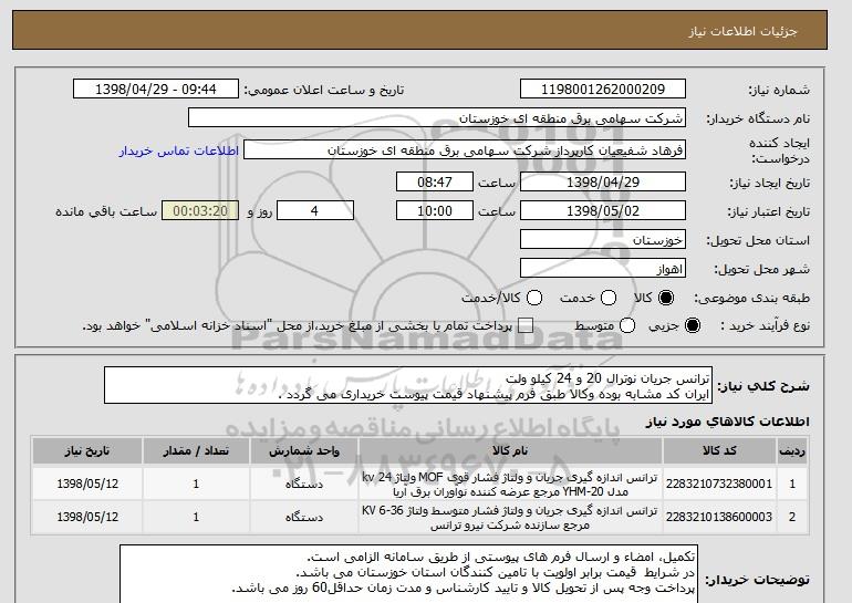 شرح کلی نیاز: ترانس جریان نوترال 20 و 24 کیلو ولت