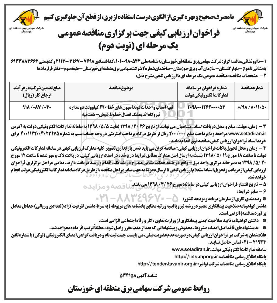 | 98/8011050/م | 2098001262000053 | تهیه استاپ و احداث فونداسیون های خط 220 کیلوولت دومداره نیروگاه اندیمشک اتصال خطوط شوش- هفت تپه |