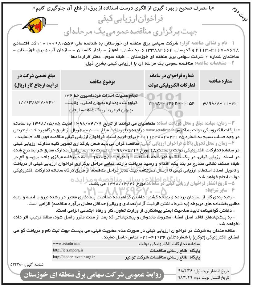 | 98/8011043/م | 2098001262000054 | انجام عملیات احداث فونداسیون خط 132 کیوولت دو مداره بهبهان اصلی - ولایت بهبهان فرعی تا رینگ شاهد، ارجان |