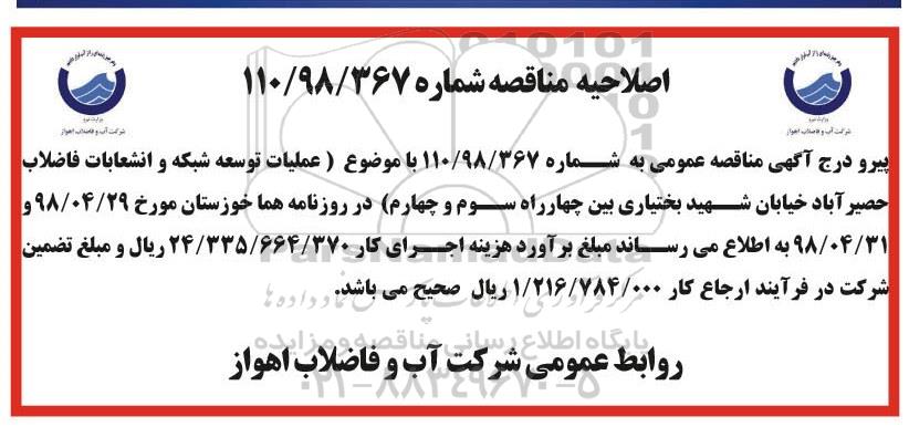 پیرو درج اگهی مناقصه عمومی به شماره 110/98/367 با موضوع عملیات توسعه شبکه و انشعاب فاضلاب حصیرآباد خیابان شهید بختیاری بین چهارراه سوم و چهارم در روزنامه هما خوزستان مورخ 98.4.29 و 98.4.31 به اطلاع می رساند مبلغ براورد هزینه اجرای کار 24.335.664.370 ریال و مبلغ تضمین شرکت در فرایند ارجاع کار 1.216.784.000 ریال صحیح می باشد