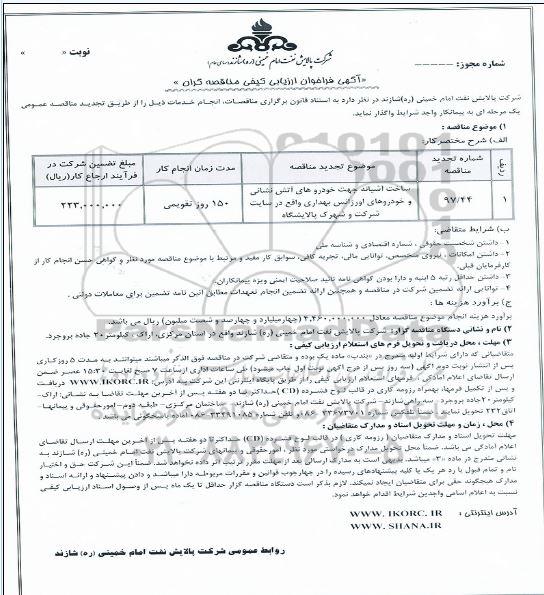 | 97/44 | ساخت آشیانه جهت خودروهای آتش نشانی و خودروهای اورژانس بهداری واقع در سایت شرکت و شهرک پالایشگاه |