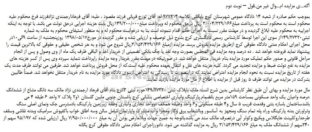 بموجب حکم صادره از شعبه 14 دادگاه عمومی شهرستان کرج بایگانی کلاسه 977214 له: آقای تورج قربانی فرزند مقصود ، علیه: آقای فرهادارجمندی نژادفرزند فرخ محکوم علیه محکوم است به محکوم است به پرداخت مبلغ3/004/229/166 ریال درحق محکوم له وپرداخت مبلغ149/200/000ریال بابت هزینه اجرایی درحق دولت می باشد. با توجه به اینکه اجراییه به محکوم علیه ابلاغ گردیده و در مهلت مقرر نسبت به اجرای حکم اقدام ننموده است بنا به درخواست محکوم له و به منظور استیفای محکوم به ملک به شماره ثبتی149/27320از سوی این اجرا توسط کارشناس رسمی دادگستری کرج بشرح ذیل توصیف و ارزیابی شده و مقرر گردیده در مورخ1398/05/17 روزپنجشنبه از ساعت 9الی10در محل اجرای احکام مدنی دادگاه حقوقی کرج ازطریق مزایده بفروش برسد. مزایده ازمبلغ 3/153/429/166ریال شروع می شود و به هر شخص حقیقی و حقوقی که بالاترین قیمت را پیشنهاد نماید فروخته خواهد شد . ده درصد وجه مزایده فی المجلس بصورت وجه نقد یا چک بانکی تضمینی از خریدار اخذ و الباقی ظرف یک ماه از وی وصول و پس از انجام مراحل قانونی و صدور حکم تملیک مورد مزایده بنام خریدار منتقل خواهد شد. در صورتیکه در مهلت مقرر خریدار وجه مزایده راپرداخت ننماید سپرده وی پس از کسر هزینه های مزایده به نفع دولت ضبط و مزایده تجدید می گردد. کلیه هزینه های نقل و انتقال بعهده محکوم علیه است.که از محل فروش پرداخت خواهد شد. طرفین می توانند ظرف مدت یک هفته از تاریخ مزایده نسبت به نحوه انجام مزایده اعتراض نمایند که دراینصورت تا رسیدگی به اعتراض ازسوی دادگاه مورد مزایده به نام خریدار منتقل نخواهد شد. ضمناً طالبین بشرکت در مزایده می توانند ظرف 5 روز قبل از مزایده با اطلاع از مال مورد مزایده بازدید نمایند.