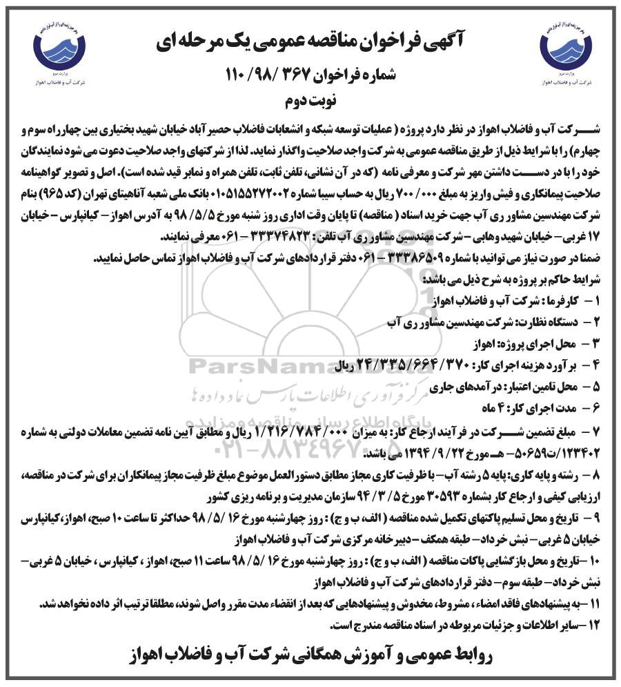 شرکت آب و فاضلاب اهواز در نظر دارد پروژه عملیات توسعه شبکه و انشعابات فاضلاب حصیرآباد - خیابان شهید بختیاری بین چهارراه سوم و چهارم را با شرایط ذیل از طریق مناقصه عمومی به شرکت واجد صلاحیت واگذار نماید. لذا از شرکت های واجد صلاحیت دعوت می شود، نمایندگان خود را با در دست داشتن مهر شرکت و معرفی نامه (که در آن نشانی، تلفن ثابت، تلفن همراه و نمابر قید است)، اصل و تصویر گواهینامه صلاحیت پیمانکاری و فیش واریز به مبلغ 700.000 ریال به حساب جام شماره 0105155272002 بانک ملی شعبه آناهیتای تهران کد 965 به نام شرکت مهندسین مشاور ری آب جهت خرید اسناد مناقصه تا پایان وقت اداری روز شنبه مورخ 98.5.5 به آدرس: اهواز، کیانپارس، خیابان 17 غربی- خیابان شهید وهابی، شرکت مهندسین مشاور ری اب تلفن شماره تلفن 33374823-061 معرفی نمایند