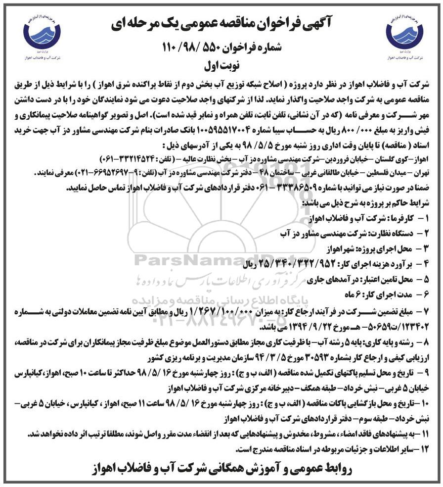 شرکت آب و فاضلاب اهواز در نظر دارد پروژه (اصلاح شبکه توزیع آب بخش دوم از نقاط پراکنده شرق اهواز) را با شرایط ذیل از طریق مناقصه عمومی به شرکت واجد صلاحیت واگذار نماید. لذا از شرکتهای واجد صلاحیت دعوت می شود، نمایندگان خود را با در دست داشتن مهر شرکت و معرفی نامه (که در آن نشانی، تلفن ثابت، تلفن همراه و نمابر قید است)، اصل و تصویر گواهینامه صلاحیت پیمانکاری و فیش واریز به مبلغ 800.000 ریال به حساب سپهر شماره 100595517004 بانک صادرات به نام شرکت مهندسی مشاور دزآب جهت خرید اسناد مناقصه تا پایان وقت اداری روز شنبه مورخ 98.5.5 به یکی از آدرس های ذیل: