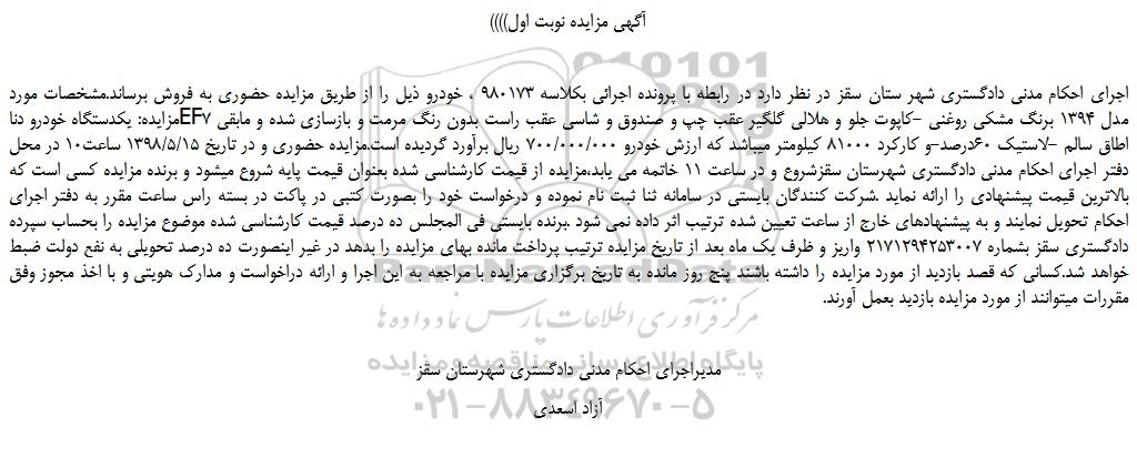 اجرای احکام مدنی دادگستری شهر ستان سقز در نظر دارد در رابطه با پرونده اجرائی بکلاسه 980173 ، خودرو ذیل را از طریق مزایده حضوری به فروش برساند.مشخصات مورد مزایده: یکدستگاه خودرو دناEF7 مدل 1394 برنگ مشکی روغنی -کاپوت جلو و هلالی گلگیر عقب چپ و صندوق و شاسی عقب راست بدون رنگ مرمت و بازسازی شده و مابقی اطاق سالم -لاستیک 60درصد-و کارکرد 81000 کیلومتر میباشد که ارزش خودرو 700/000/000 ریال برآورد گردیده است.مزایده حضوری و در تاریخ 1398/5/15 ساعت10 در محل دفتر اجرای احکام مدنی دادگستری شهرستان سقزشروع و در ساعت 11 خاتمه می یابد،مزایده از قیمت کارشناسی شده بعنوان قیمت پایه شروع میشود و برنده مزایده کسی است که بالاترین قیمت پیشنهادی را ارائه نماید .شرکت کنندگان بایستی در سامانه ثنا ثبت نام نموده و درخواست خود را بصورت کتبی در پاکت در بسته راس ساعت مقرر به دفتر اجرای احکام تحویل نمایند و به پیشنهادهای خارج از ساعت تعیین شده ترتیب اثر داده نمی شود .برنده بایستی فی المجلس ده درصد قیمت کارشناسی شده موضوع مزایده را بحساب سپرده دادگستری سقز بشماره 2171294253007 واریز و ظرف یک ماه بعد از تاریخ مزایده ترتیب پرداخت مانده بهای مزایده را بدهد در غیر اینصورت ده درصد تحویلی به نفع دولت ضبط خواهد شد.کسانی که قصد بازدید از مورد مزایده را داشته باشند پنج روز مانده به تاریخ برگزاری مزایده با مراجعه به این اجرا و ارائه دراخواست و مدارک هویتی و با اخذ مجوز وفق مقررات میتوانند از مورد مزایده بازدید بعمل آورند.