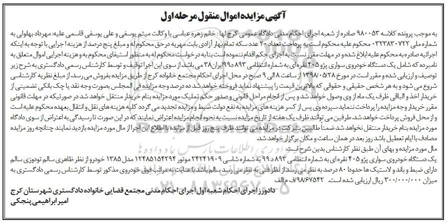 مزایده : یک دستگاه خودرو سواری پژو 405 نقره ای مدل 1385 به ارزش 300.000.000 ریال