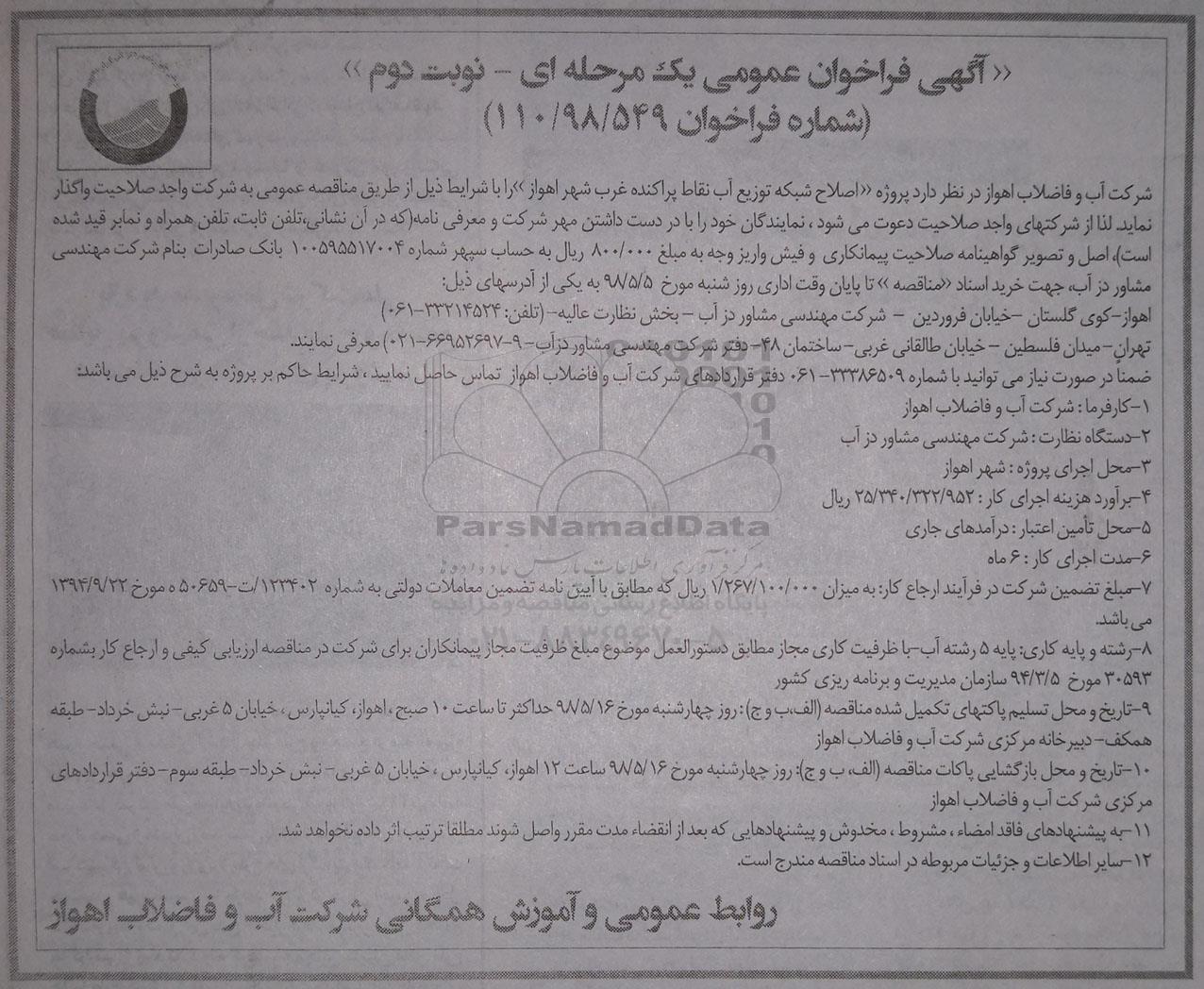 شرکت آب و فاضلاب اهواز در نظر دارد پروژه (اصلاح شبکه توزیع آب نقاط پراکنده غرب اهواز) را با شرایط ذیل از طریق مناقصه عمومی به شرکت واجد صلاحیت واگذار نماید. لذا از شرکتهای واجد صلاحیت دعوت می شود، نمایندگان خود را با در دست داشتن مهر شرکت و معرفی نامه (که در آن نشانی، تلفن ثابت، تلفن همراه و نمابر قید است)، اصل و تصویر گواهینامه صلاحیت پیمانکاری و فیش واریز به مبلغ 800.000 ریال به حساب سپهر شماره 100595517004 بانک صادرات به نام شرکت مهندسی مشاور دزآب جهت خرید اسناد مناقصه تا پایان وقت اداری روز شنبه مورخ 98.5.5 به یکی از آدرس های ذیل:
