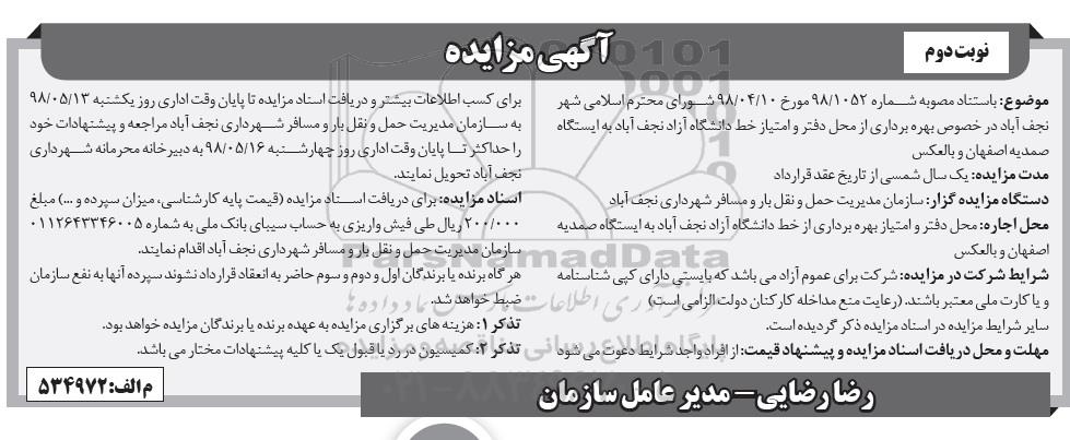 دستگاه مزایده گذار: سازمان مدیریت حمل و نقل بار و مسافر شهرداری نجف آباد