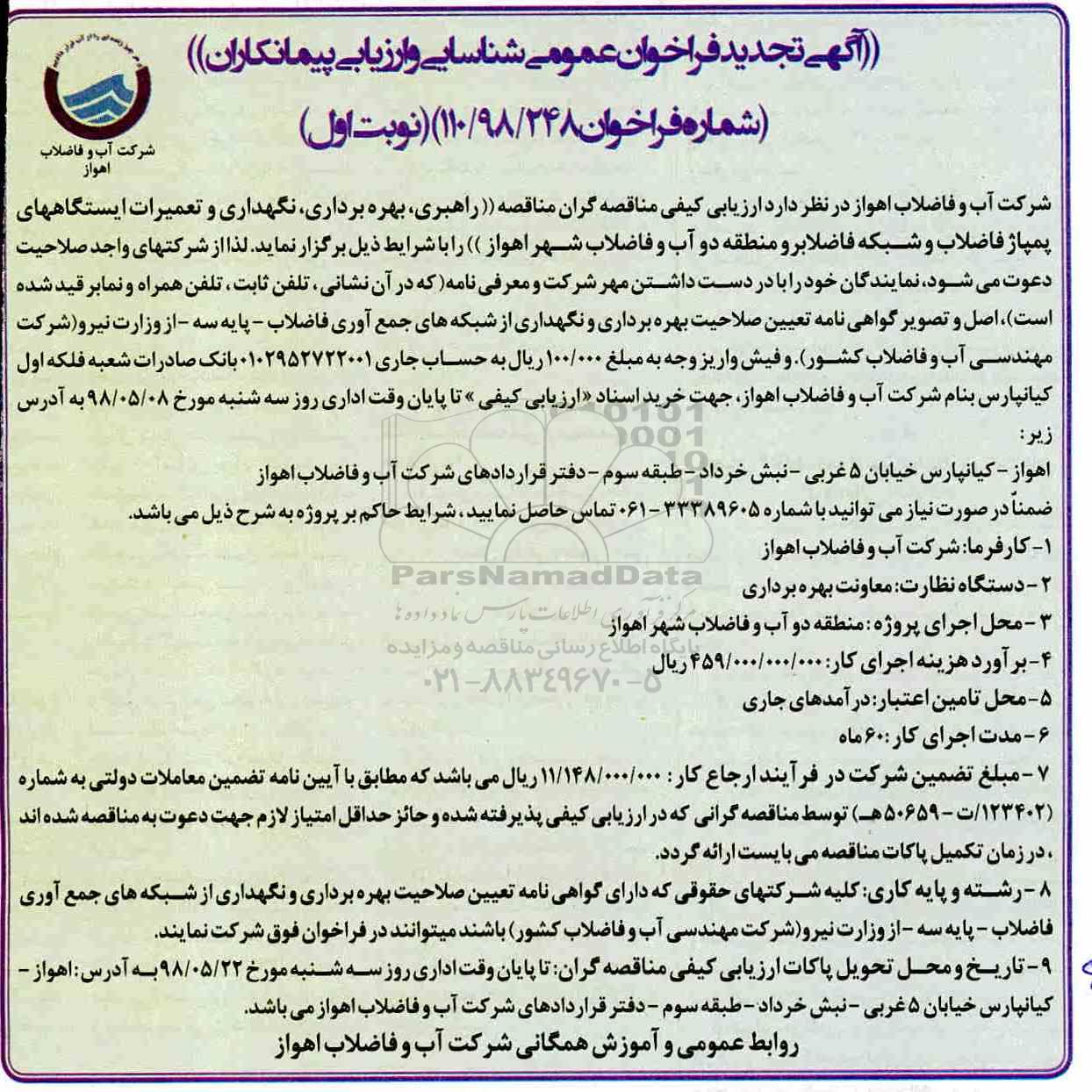 شرکت آب و فاضلاب اهواز در نظر دارد ارزیابی کیفی مناقصه گران مناقصه راهبردی، بهره برداری، نگهداری و تعمیرات ایستگاههای پمپاژ فاضلاب و شبکه فاضلابرو منطقه دو آب و فاضلاب شهر اهواز را با شرایط ذیل برگزار نماید لذا از شرکت های واجدصلاحیت دعوت می شود نمایندگان خود را با در دست داشتن مهر شرکت و معرفی نامه (که در آن نشانی، تلفن ثابت، تلفن همراه و نمابر قید شده است)اصل و تصویر گواهی نامه تعیین صلاحیت بهره برداری و نگهداری از شبکه های جمع آوری فاضلاب - پایه سه- از وزارت نیرو (شرکت مهندسی آب و فاضلاب کشور) و فیش واریز وجه به مبلغ 100.000 ریال به حساب جاری شماره ۰۱۰۲۹۵۲۷۲۲۰۰۱ بانک صادرات شعبه فلکه اول کیانپارس بنام شرکت آب و فاضلاب اهواز ، جهت خرید اسناد ‹‹ارزیابی ›› تا پایان وقت اداری روز چهارشنبه مورخ 98.05.8 به آدرس زیر: