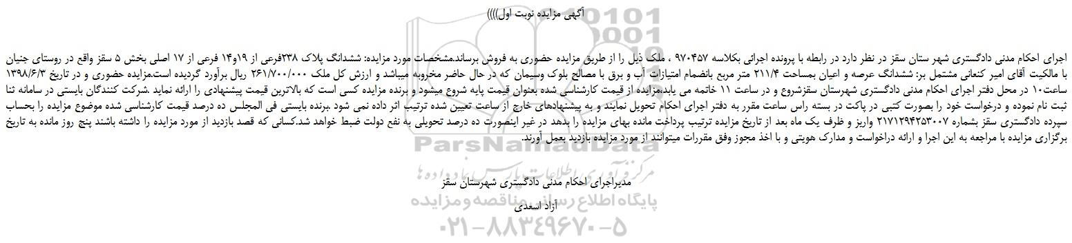 اجرای احکام مدنی دادگستری شهر ستان سقز در نظر دارد در رابطه با پرونده اجرائی بکلاسه 970457 ، ملک ذیل را از طریق مزایده حضوری به فروش برساند.مشخصات مورد مزایده: ششدانگ پلاک 238فرعی از 19و14 فرعی از 17 اصلی بخش 5 سقز واقع در روستای جنیان با مالکیت آقای امیر کنعانی مشتمل بر: ششدانگ عرصه و اعیان بمساحت 211/4 متر مربع بانضمام امتیازات آب و برق با مصالح بلوک وسیمان که در حال حاضر مخروبه میباشد و ارزش کل ملک 261/700/000 ریال برآورد گردیده است.مزایده حضوری و در تاریخ 1398/6/3 ساعت10 در محل دفتر اجرای احکام مدنی دادگستری شهرستان سقزشروع و در ساعت 11 خاتمه می یابد،مزایده از قیمت کارشناسی شده بعنوان قیمت پایه شروع میشود و برنده مزایده کسی است که بالاترین قیمت پیشنهادی را ارائه نماید .شرکت کنندگان بایستی در سامانه ثنا ثبت نام نموده و درخواست خود را بصورت کتبی در پاکت در بسته راس ساعت مقرر به دفتر اجرای احکام تحویل نمایند و به پیشنهادهای خارج از ساعت تعیین شده ترتیب اثر داده نمی شود .برنده بایستی فی المجلس ده درصد قیمت کارشناسی شده موضوع مزایده را بحساب سپرده دادگستری سقز بشماره 2171294253007 واریز و ظرف یک ماه بعد از تاریخ مزایده ترتیب پرداخت مانده بهای مزایده را بدهد در غیر اینصورت ده درصد تحویلی به نفع دولت ضبط خواهد شد.کسانی که قصد بازدید از مورد مزایده را داشته باشند پنج روز مانده به تاریخ برگزاری مزایده با مراجعه به این اجرا و ارائه دراخواست و مدارک هویتی و با اخذ مجوز وفق مقررات میتوانند از مورد مزایده بازدید بعمل آورند.