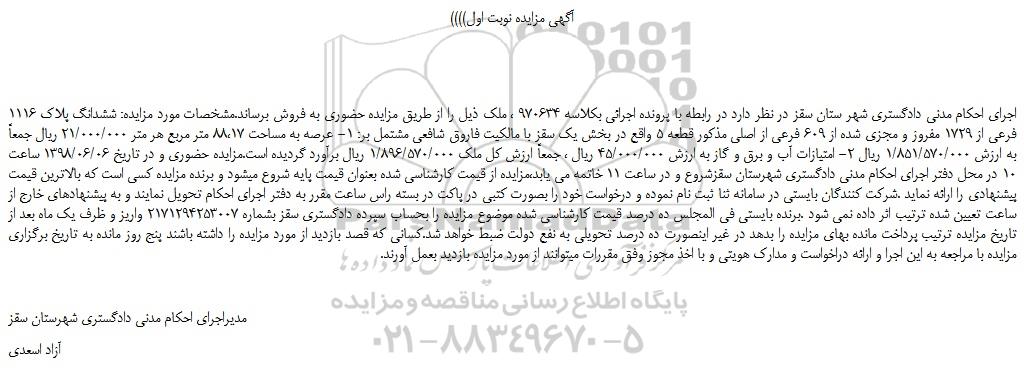مزایده فروش ششدانگ پلاک 1116 فرعی از 1729 مفروز و مجزی شده از 609 فرعی از اصلی , مزایده، مزایده فروش ششدانگ پلاک 1116 فرعی از 1729 مفروز و مجزی شده از 609 فرعی از اصلی