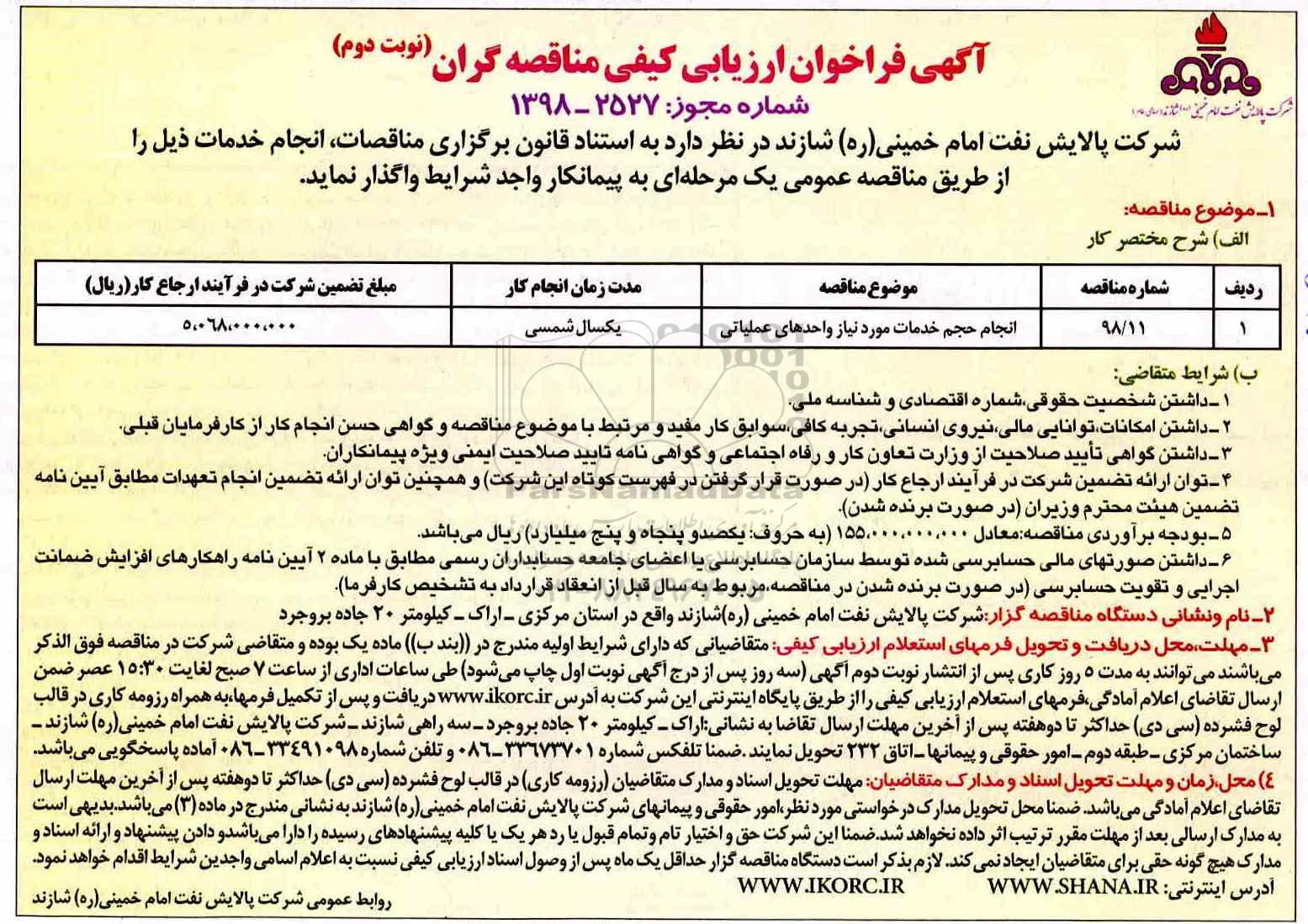 شرکت پالایش نفت امام خمینی (ره) شازند در نظر دارد به استناد قانون برگزاری مناقصات، انجام خدمات ذیل را از طریق مناقصه عمومی یک مرحله ای به پیمانکار واجد شرایط واگذار نماید.