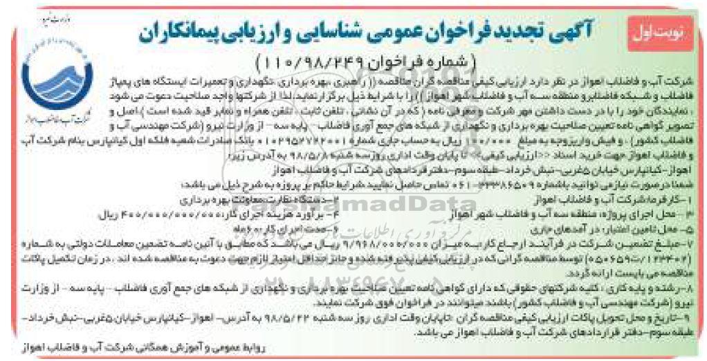 شرکت آب و فاضلاب اهواز در نظر دارد ارزیابی کیفی مناقصه گران مناقصه راهبردی، بهره برداری، نگهداری و تعمیرات ایستگاههای پمپاژ فاضلاب و شبکه فاضلابرو منطقه سه  آب و فاضلاب شهر اهواز  را با شرایط ذیل برگزار نماید لذا از شرکت های واجدصلاحیت دعوت می شود نمایندگان خود را با در دست داشتن مهر شرکت و معرفی نامه (که در آن نشانی، تلفن ثابت، تلفن همراه و نمابر قید شده است)اصل و تصویر گواهی نامه تعیین صلاحیت بهره برداری و نگهداری از شبکه های جمع آوری فاضلاب - پایه سه- از وزارت نیرو (شرکت مهندسی آب و فاضلاب کشور) و فیش واریز وجه به مبلغ 100.000 ریال به حساب جاری شماره 0102952722001  بانک صادرات شعبه فلکه اول کیانپارس بنام شرکت آب و فاضلاب اهواز ، جهت خرید اسناد ‹‹ارزیابی ›› تا پایان وقت اداری روز چهارشنبه مورخ 98.05.8  به آدرس زیر: