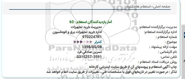 اداره برگزارکننده استعلام: اداره خرید تجهیزات برق و اتوماسیون