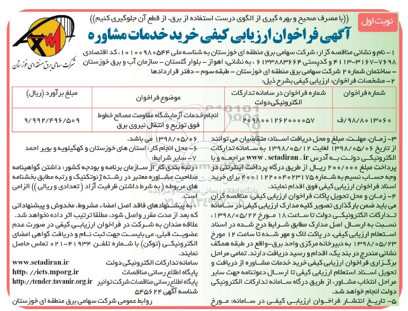 | 98/8013060/ف | 2098001262000057 | انجام خدمات آزمایشگاه مقاومت مصالح خطوط فوق توزیع و انتقال نیروی برق |