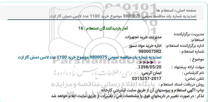 موضوع : تمدید شماره یک مناقصه عمومی 9800075 موضوع خرید 1100 عدد لانس دمش گاز ازت