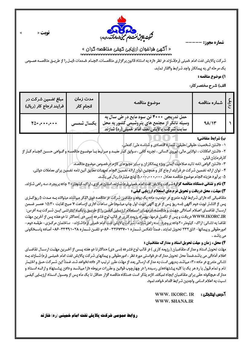 | 98/13 | حمل تدریجی 4000 تن سود مایع در طی سال به وسیله تانکر از مجتمع های پتروشیمی کشور به محل سایت شرکت پالایش نفت امام خمینی (ره) شازند | یکسال شمسی | 250.000.000 |
