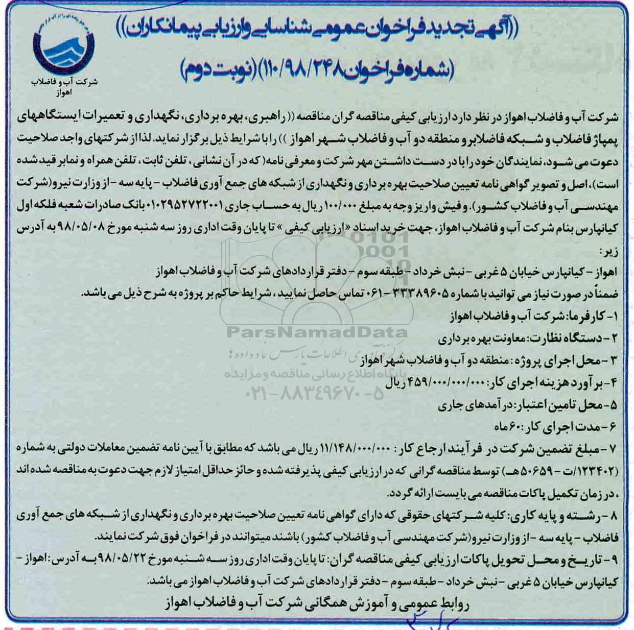 شرکت آب و فاضلاب اهواز در نظر دارد ارزیابی کیفی مناقصه گران مناقصه راهبردی، بهره برداری، نگهداری و تعمیرات ایستگاههای پمپاژ فاضلاب و شبکه فاضلابرو منطقه دو آب و فاضلاب شهر اهواز را با شرایط ذیل برگزار نماید لذا از شرکت های واجدصلاحیت دعوت می شود نمایندگان خود را با در دست داشتن مهر شرکت و معرفی نامه (که در آن نشانی، تلفن ثابت، تلفن همراه و نمابر قید شده است)اصل و تصویر گواهی نامه تعیین صلاحیت بهره برداری و نگهداری از شبکه های جمع آوری فاضلاب - پایه سه- از وزارت نیرو (شرکت مهندسی آب و فاضلاب کشور) و فیش واریز وجه به مبلغ 100.000 ریال به حساب جاری شماره 0102952722001 بانک صادرات شعبه فلکه اول کیانپارس بنام شرکت آب و فاضلاب اهواز ، جهت خرید اسناد ‹‹ارزیابی ›› تا پایان وقت اداری روز چهارشنبه مورخ 98.05.8 به آدرس زیر: