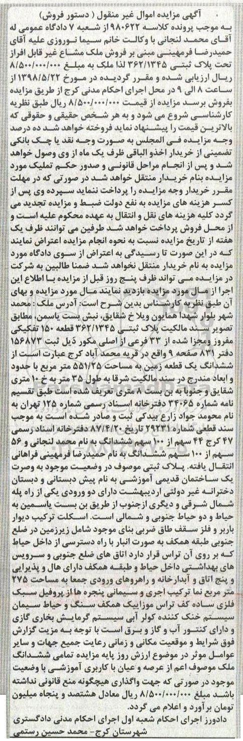 مزایده ششدانگ یک قطعه زمین 551.25 مترمربع کلاسه 980622