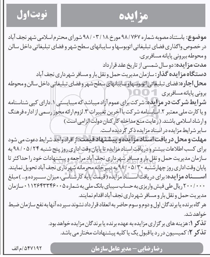موضوع: به استناد مصوبه شماره 98/767 مورخ 98.3.18 شورای محترم اسلام شهر نجف آباد در خصوص واگذاری فضای تبلیغاتی اتوبوسها و سایبانهای سطح شهر و فضای تبلیغاتی داخل سالن و محوطه بیرونی پایانه مسافربری