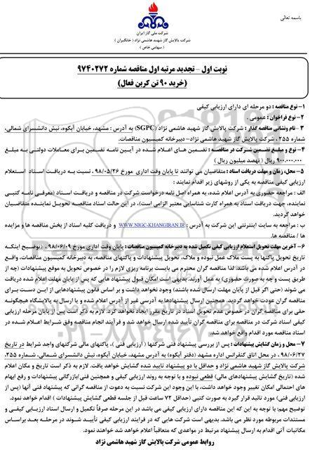 نام و نشانی مناقصه گزار: شرکت پالایش گاز شهید هاشمی نژاد (SGPC)  به آدرس: مشهد - خیابان ابکوه - نبش دانشسرای شمالی شماره 255 - شرکت پالایش گاز شهید هاشمی نژاد - دبیرخانه کمیسیون مناقصات