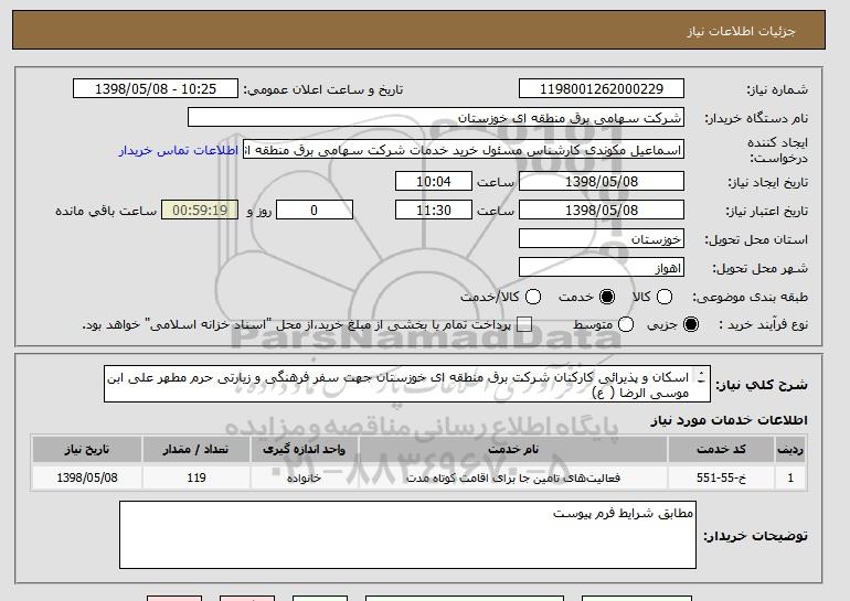 شرح کلی نیاز: اسکان و پذیرائی کارکنان شرکت برق منطقه ای خوزستان جهت سفر فرهنگی و زیارتی حرم مطهر علی ابن موسی الرضا ( ع)