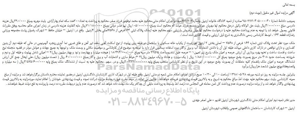 بموجب دادنامة شمارة 9509970405000040 صادره از شعبه 3دادگاه خانواده اردبیل وشماره970912شعبه دو اجرای احکام مدنی، محکوم علیه محمد نوظهور فرزند صفر، محکوم به پرداخت به تعداد200عدد سکه تمام بهارآزادی بابت مهریه ومبلغ 390/000ریال هزینه دادرسی مبلغ 4/000/000ریال بابت حق الوکاله وکیل درحق محکوم لها مهربان جولانی دمدمه فرزند حیات اله محکوم است ومبلغ105/000/000ریال نیم عشر دولتی ومبلغ 71/180/000ریال مابه التفاوت هزینه دادرسی در زمان اجرای حکم محاسبه ووفق مقررات قانونی وصول خواهد شد با توجه به عدم پرداخت محکوم علیه با درخواست محکوم لها مبنی برفروش وارزیابی سهم محکوم علیه ازملک پلاک ثبتی 164فرعی از 7568اصلی بخش 2اردبیل واقع در : اردبیل – خیابان حافظ – شهرک رضوان پشت مجموعه ورزشی رضازاده قطعه 164 ، توسط کارشناس رسمی دادگستری به شرح ذیل ارزیابی و قیمت گذاری شده است./.