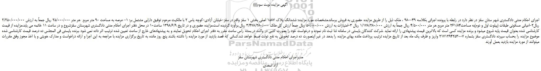 اجرای احکام مدنی دادگستری شهر ستان سقز در نظر دارد در رابطه با پرونده اجرائی بکلاسه 980049 ، ملک ذیل را از طریق مزایده حضوری به فروش برساند.مشخصات مورد مزایده: ششدانگ پلاک 1587 اصلی بخش 1 سقز واقع در سقز-خیابان آزادی-کوچه یاس 2 با مالکیت مرحوم توفیق دارایی مشتمل بر: 1- عرصه به مساحت 90 متر مربع  هر متر 25/000/000 ریال جمعاً به ارزش 2/250/000/000 ریال2-اعیانی مسکونی طبقات (پیلوت اول و دوم)به مساحت261/84 متر مربع هر متر 4/500/000 ریال جمعاً به ارزش 1/178/280/000 ریال 3-امتیازات به ارزش 50/000/000 ریال جمعاً ارزش کل ملک 3/478/280/000 ریال برآورد گردیده است.مزایده حضوری و در تاریخ 1398/6/9 ساعت10 در محل دفتر اجرای احکام مدنی دادگستری شهرستان سقزشروع و در ساعت 11 خاتمه می یابد،مزایده از قیمت کارشناسی شده بعنوان قیمت پایه شروع میشود و برنده مزایده کسی است که بالاترین قیمت پیشنهادی را ارائه نماید .شرکت کنندگان بایستی در سامانه ثنا ثبت نام نموده و درخواست خود را بصورت کتبی در پاکت در بسته راس ساعت مقرر به دفتر اجرای احکام تحویل نمایند و به پیشنهادهای خارج از ساعت تعیین شده ترتیب اثر داده نمی شود .برنده بایستی فی المجلس ده درصد قیمت کارشناسی شده موضوع مزایده را بحساب سپرده دادگستری سقز بشماره 2171294253007 واریز و ظرف یک ماه بعد از تاریخ مزایده ترتیب پرداخت مانده بهای مزایده را بدهد در غیر اینصورت ده درصد تحویلی به نفع دولت ضبط خواهد شد.کسانی که قصد بازدید از مورد مزایده را داشته باشند پنج روز مانده به تاریخ برگزاری مزایده با مراجعه به این اجرا و ارائه دراخواست و مدارک هویتی و با اخذ مجوز وفق مقررات میتوانند از مورد مزایده بازدید بعمل آورند
