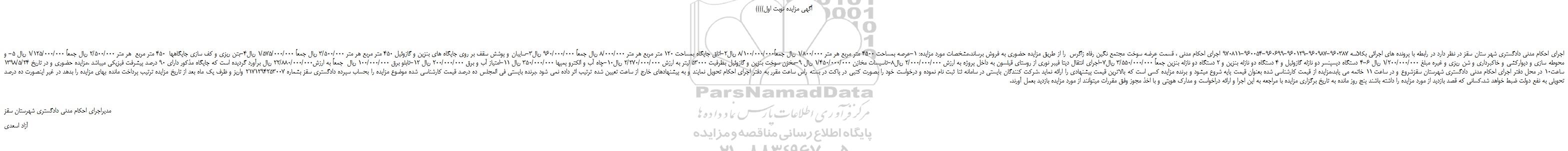 اجرای احکام مدنی دادگستری شهر ستان سقز در نظر دارد در رابطه با پرونده های اجرائی بکلاسه 960387-960987-960129-960699-960054-970811 اجرای احکام مدنی ، قسمت عرضه سوخت مجتمع نگین رفاه زاگرس  را از طریق مزایده حضوری به فروش برساند.مشخصات مورد مزایده: 1-عرصه بمساحت 4500 متر مربع هر متر 1/800/000 ریال جمعاً8/100/000/000 ریال2-اتاق جایگاه بمساحت 120 متر مربع هر متر 8/000/000 ریال جمعاً 960/000/000 ریال3-سایبان و پوشش سقف بر روی جایگاه های بنزین و گازوئیل 450 متر مربع هر متر 3/500/000 ریال جمعاً 1/575/000/000 ریال4-بتن ریزی و کف سازی جایگاهها  450 متر مربع  هر متر 2/500/000 ریال جمعاً 1/125/000/000 ریال 5- و محوطه سازی و دیوارکشی و خاکبرداری و شن ریزی و غیره مبلغ 1/200/000/000 ریال 6-4 دستگاه دیسپنسر دو نازله گازوئیل و 4 دستگاه دو نازله بنزین و 2 دستگاه دو نازله بنزین جمعاً 3/550/000/000 ریال7-اجرای انتقال دیتا فیبر نوری از روستای قیلسون به داخل پروژه به ارزش 2/000/000/000 ریال8-تاسیسات مخازن 1/450/000/000 ریال 9-مخزن سوخت بنزین و گازوئیل بظرفیت 53000 لیتر به ارزش 2/270/000/000 ریال10-چاه آب و الکترو پمپها 350/000/000 ریال 11-امتیاز آب و برق 200/000/000 ریال 12-تابلو برق 100/000/000 ریال  جمعاً به ارزش22/880/000/000 ریال برآورد گردیده است که جایگاه مذکور دارای 90 درصد پیشرفت فیزیکی میباشد .مزایده حضوری و در تاریخ 1398/5/24 ساعت10 در محل دفتر اجرای احکام مدنی دادگستری شهرستان سقزشروع و در ساعت 11 خاتمه می یابد،مزایده از قیمت کارشناسی شده بعنوان قیمت پایه شروع میشود و برنده مزایده کسی است که بالاترین قیمت پیشنهادی را ارائه نماید .شرکت کنندگان بایستی در سامانه ثنا ثبت نام نموده و درخواست خود را بصورت کتبی در پاکت در بسته راس ساعت مقرر به دفتر اجرای احکام تحویل نمایند و به پیشنهادهای خارج از ساعت تعیین شده ترتیب اثر داده نمی شود .برنده بایستی فی المجلس ده درصد قیمت کارشناسی شده موضوع مزایده را بحساب سپرده دادگستری سقز بشماره 2171294253007 واریز و ظرف یک ماه بعد از تاریخ مزایده ترتیب پرداخت مانده بهای مزایده را بدهد در غیر اینصورت ده درصد تحویلی به نفع دولت ضبط خواهد شد.کسانی که قصد بازدید از مورد مزایده را داشته باشند پنج روز مانده به تاریخ برگزاری مزایده با مراجعه به این اجرا و ارائه دراخواست و مدارک هویتی و با اخذ مجوز وفق مقررات میتوانند از مورد مزایده بازدید بعمل آورند.