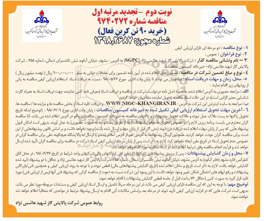 تجدید مناقصه خرید 90 تن کربن فعال - نوبت دوم از کلیه افراد متخصص و شرکتها واجد شرایط دعوت به عمل میآید در مناقصه با کد خبرگزاری پارس نماد: 1810659 شرکت نمایند.