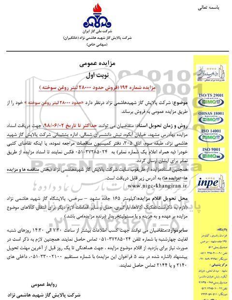 موضوع: شركت پالایش گاز شهید هاشمی نژاد در نظر دارد (حدود 28000 لیتر روغن سوخته) خود را از طریق مزایده عمومی به فروش برساند.
