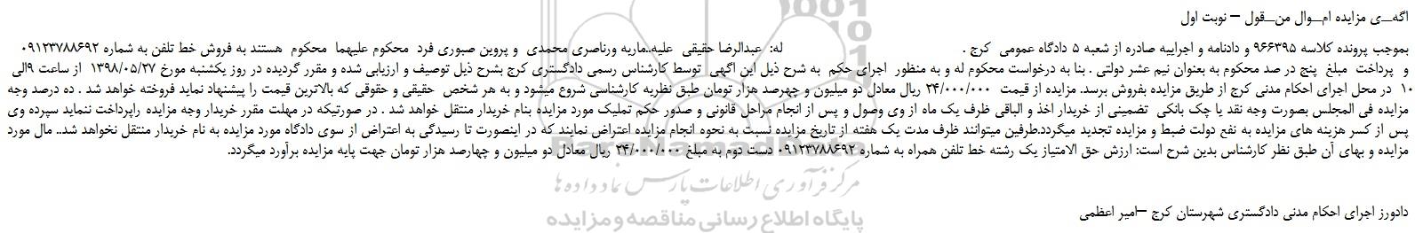 بموجب پرونده کلاسه 966395 و دادنامه و اجراییه صادره از شعبه 5 دادگاه عمومی کرج . له: عبدالرضا حقیقی علیه..ماریه ورناصری محمدی و پروین صبوری فرد محکوم علیهما محکوم هستند به فروش خط تلفن به شماره 09123788692 و پرداخت مبلغ پنج در صد محکوم به بعنوان نیم عشر دولتی . بنا به درخواست محکوم له و به منظور اجرای حکم به شرح ذیل این اگهی توسط کارشناس رسمی دادگستری کرج بشرح ذیل توصیف و ارزیابی شده و مقرر گردیده در روز یکشنبه مورخ 1398/05/27 از ساعت 9الی 10 در محل اجرای احکام مدنی کرج از طریق مزایده بفروش برسد. مزایده از قیمت 24/000/000 ریال معادل دو میلیون و چهرصد هزار تومان طبق نظریه کارشناسی شروع میشود و به هر شخص حقیقی و حقوقی که بالاترین قیمت را پیشنهاد نماید فروخته خواهد شد . ده درصد وجه مزایده فی المجلس بصورت وجه نقد یا چک بانکی تضمینی از خریدار اخذ و الباقی ظرف یک ماه از وی وصول و پس از انجام مراحل قانونی و صدور حکم تملیک مورد مزایده بنام خریدار منتقل خواهد شد . در صورتیکه در مهلت مقرر خریدار وجه مزایده راپرداخت ننماید سپرده وی پس از کسر هزینه های مزایده به نفع دولت ضبط و مزایده تجدید میگردد.طرفین میتوانند ظرف مدت یک هفته از تاریخ مزایده نسبت به نحوه انجام مزایده اعتراض نمایند که در اینصورت تا رسیدگی به اعتراض از سوی دادگاه مورد مزایده به نام خریدار منتقل نخواهد شد.. مال مورد مزایده و بهای آن طبق نظر کارشناس بدین شرح است: ارزش حق الامتیاز یک رشته خط تلفن همراه به شماره 09123788692 دست دوم به مبلغ 24/000/000 ریال معادل دو میلیون و چهارصد هزار تومان جهت پایه مزایده برآورد میگردد.