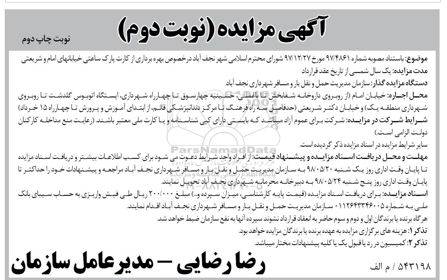 مزایده, مزایده بهره برداری کارت پارک ساعتی- نوبت دوم چاپ دوم