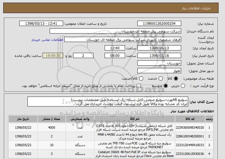 شرح کلی نیاز: سوئیچ 48پورت-سوئیچ صنعتی-کابل شبکه- رک ایستاده(طبق مشخصات پیوست)
