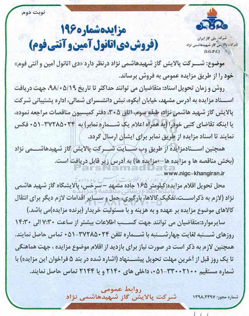 موضوع: شرکت پالایش گاز شهید هاشمی نژاد در نظر دارد دی اتانول آمین و آنتی فوم خود را از طریق مزایده عمومی به فروش برساند