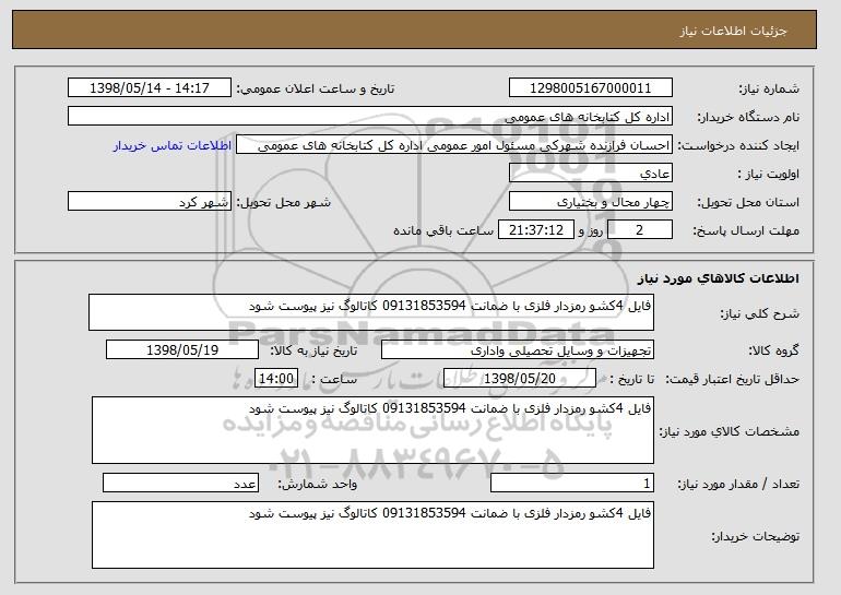 شرح کلی نیاز: فایل 4کشو رمزدار فلزی با ضمانت 09131853594 کاتالوگ نیز پیوست شود