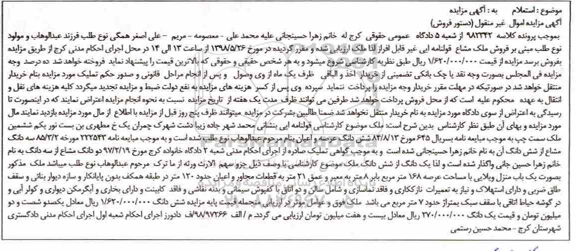 مزایده یکباب منزل ویلایی 168 مترمربع کلاسه 982342