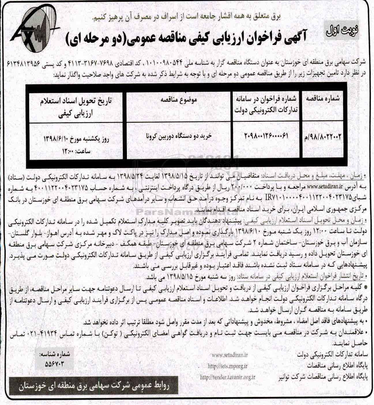 فراخوان ارزیابی کیفی خرید دو دستگاه دوربین کرونا از کلیه افراد متخصص و شرکتها واجد شرایط دعوت به عمل میآید در مناقصه با کد خبرگزاری پارس نماد: 1820213 شرکت نمایند.