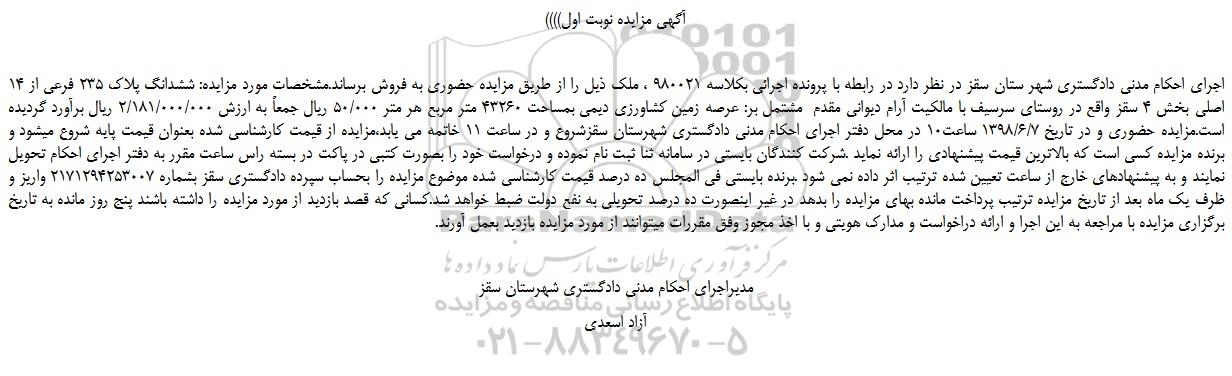 اجرای احکام مدنی دادگستری شهر ستان سقز در نظر دارد در رابطه با پرونده اجرائی بکلاسه 980021 ، ملک ذیل را از طریق مزایده حضوری به فروش برساند.مشخصات مورد مزایده: ششدانگ پلاک 235 فرعی از 14 اصلی بخش 4 سقز واقع در روستای سرسیف با مالکیت آرام دیوانی مقدم مشتمل بر: عرصه زمین کشاورزی دیمی بمساحت 43260 متر مربع هر متر 50/000 ریال جمعاً به ارزش 2/181/000/000 ریال برآورد گردیده است.مزایده حضوری و در تاریخ 1398/6/7 ساعت10 در محل دفتر اجرای احکام مدنی دادگستری شهرستان سقزشروع و در ساعت 11 خاتمه می یابد،مزایده از قیمت کارشناسی شده بعنوان قیمت پایه شروع میشود و برنده مزایده کسی است که بالاترین قیمت پیشنهادی را ارائه نماید .شرکت کنندگان بایستی در سامانه ثنا ثبت نام نموده و درخواست خود را بصورت کتبی در پاکت در بسته راس ساعت مقرر به دفتر اجرای احکام تحویل نمایند و به پیشنهادهای خارج از ساعت تعیین شده ترتیب اثر داده نمی شود .برنده بایستی فی المجلس ده درصد قیمت کارشناسی شده موضوع مزایده را بحساب سپرده دادگستری سقز بشماره 2171294253007 واریز و ظرف یک ماه بعد از تاریخ مزایده ترتیب پرداخت مانده بهای مزایده را بدهد در غیر اینصورت ده درصد تحویلی به نفع دولت ضبط خواهد شد.کسانی که قصد بازدید از مورد مزایده را داشته باشند پنج روز مانده به تاریخ برگزاری مزایده با مراجعه به این اجرا و ارائه دراخواست و مدارک هویتی و با اخذ مجوز وفق مقررات میتوانند از مورد مزایده بازدید بعمل آورند.