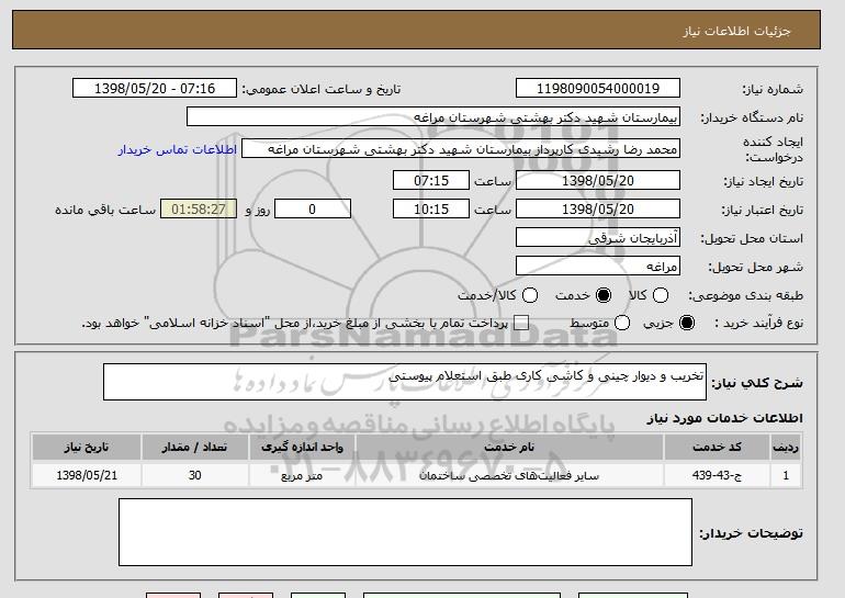 شرح کلی نیاز: تخریب و دیوار چینی و کاشی کاری طبق استعلام پیوستی