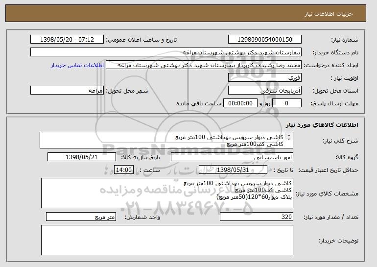 شرح کلی نیاز: کاشی دیوار سرویس بهداشتی 100متر مربع