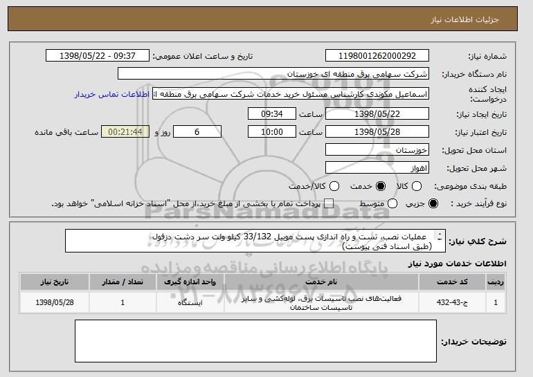شرح کلی نیاز: عملیات نصب، تست و راه اندازی پست موبیل 33/132 کیلو ولت سر دشت دزفول