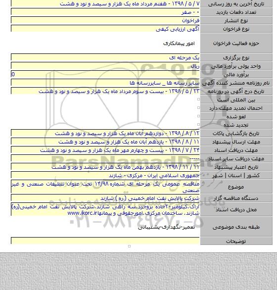 مناقصه عمومی یک مرحله ای شماره ۱۴/۹۸ تحت عنوان تنظیفات صنعتی و غیر صنعتی