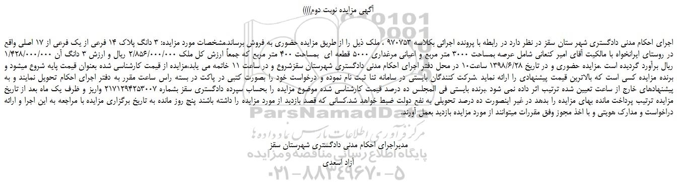 اجرای احکام مدنی دادگستری شهر ستان سقز در نظر دارد در رابطه با پرونده اجرائی بکلاسه 970753 ، ملک ذیل را از طریق مزایده حضوری به فروش برساند.مشخصات مورد مزایده: 3 دانگ پلاک 14 فرعی از یک فرعی از 17 اصلی واقع در روستای ایرانخواه با مالکیت آقای امیر کنعانی شامل عرصه بمساحت 3000 متر مربع و اعیانی مرغداری 5000 قطعه ای بمساحت 400 متر مربع که جمعاً ارزش کل ملک 2/856/000/000 ریال و ارزش 3 دانگ آن 1/428/000/000 ریال برآورد گردیده است .مزایده حضوری و در تاریخ 1398/6/28 ساعت10 در محل دفتر اجرای احکام مدنی دادگستری شهرستان سقزشروع و در ساعت 11 خاتمه می یابد،مزایده از قیمت کارشناسی شده بعنوان قیمت پایه شروع میشود و برنده مزایده کسی است که بالاترین قیمت پیشنهادی را ارائه نماید .شرکت کنندگان بایستی در سامانه ثنا ثبت نام نموده و درخواست خود را بصورت کتبی در پاکت در بسته راس ساعت مقرر به دفتر اجرای احکام تحویل نمایند و به پیشنهادهای خارج از ساعت تعیین شده ترتیب اثر داده نمی شود .برنده بایستی فی المجلس ده درصد قیمت کارشناسی شده موضوع مزایده را بحساب سپرده دادگستری سقز بشماره 2171294253007 واریز و ظرف یک ماه بعد از تاریخ مزایده ترتیب پرداخت مانده بهای مزایده را بدهد در غیر اینصورت ده درصد تحویلی به نفع دولت ضبط خواهد شد.کسانی که قصد بازدید از مورد مزایده را داشته باشند پنج روز مانده به تاریخ برگزاری مزایده با مراجعه به این اجرا و ارائه دراخواست و مدارک هویتی و با اخذ مجوز وفق مقررات میتوانند از مورد مزایده بازدید بعمل آورند.